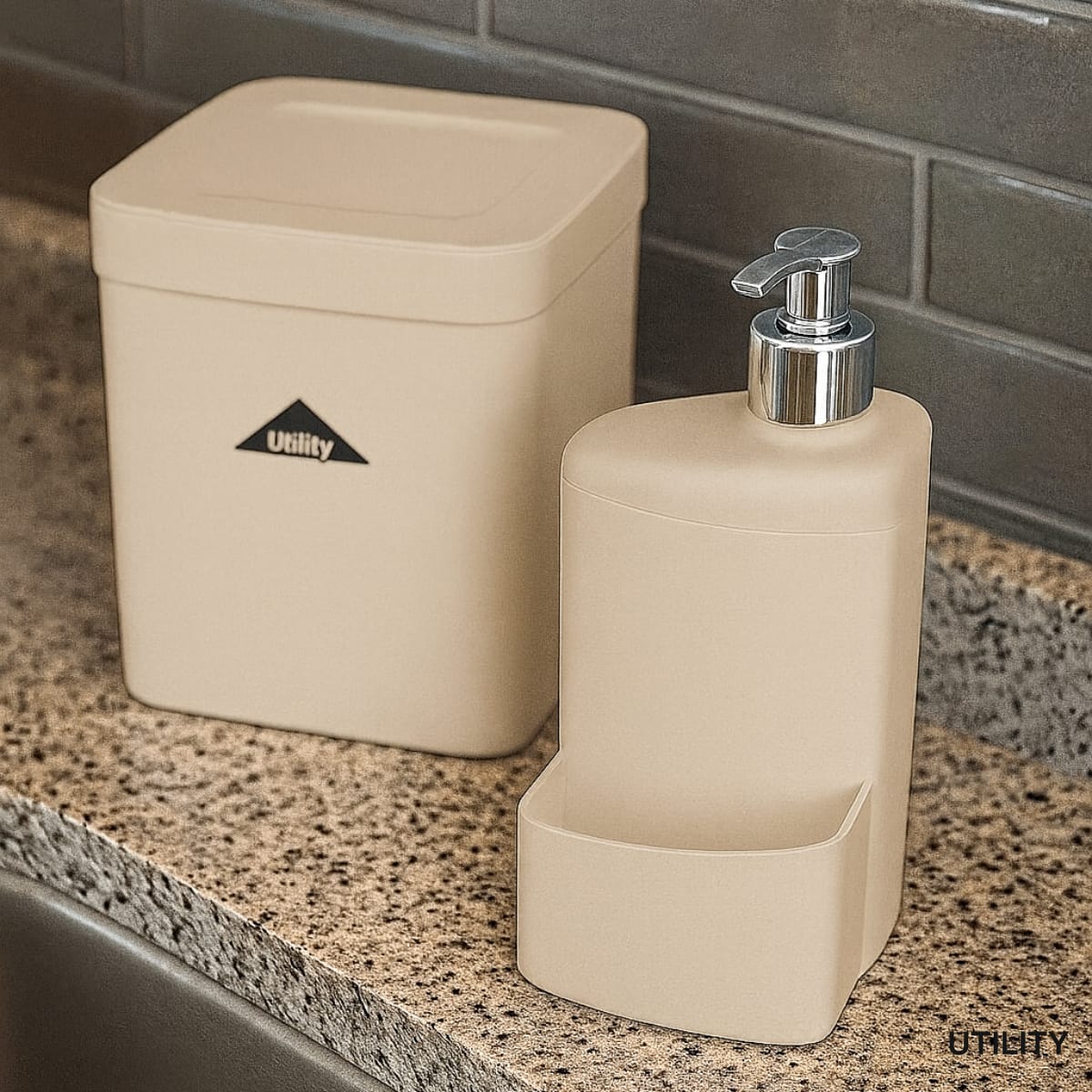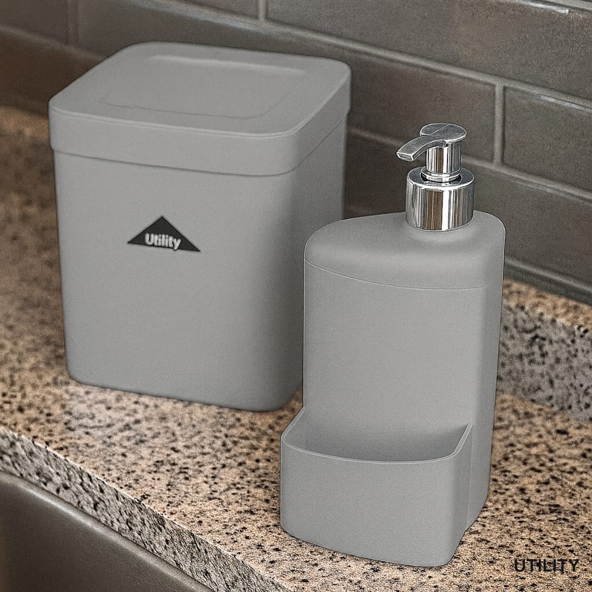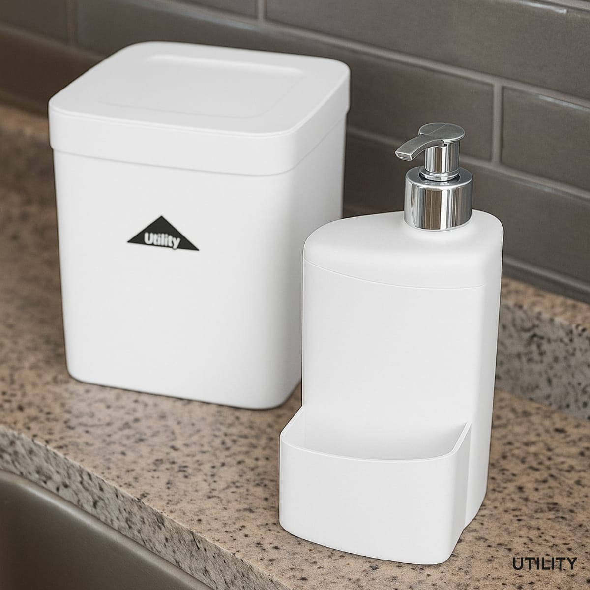 a lixeira compacta possui tampa basculante, ideal para pequenos resíduos, enquanto o dispenser com suporte lateral mantém detergente, sabonete ou esponja sempre à mão.