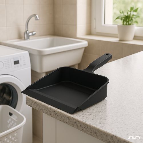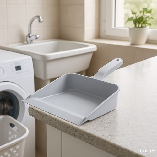 Boca ampla e aba rente ao chão para recolher sem perder farelos.