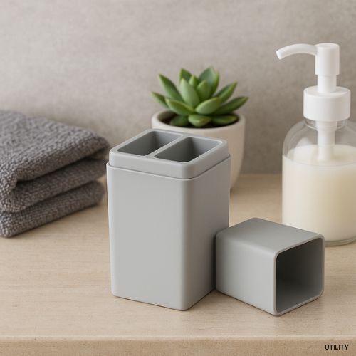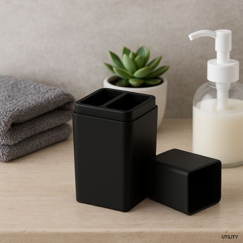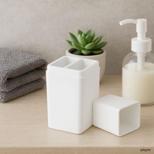 Acabamento fosco, plástico resistente e base estável — perfeito para banheiro e lavabo.